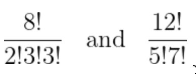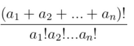 So to start, I want to remind y’all that the things being factorialized and multiplied in the denominator all add up to the numerator. I am going to use a specific example to illustrate this and work through the ideas:
